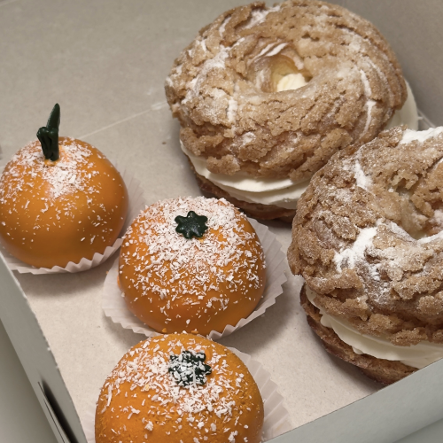 - Состав: 5 вкусных пирожных: два заварных кольца с разными начинками и 3 пирожных Картошка в виде "мандарина" Кольцо с Дор блю (Заварное кольцо, кракелин, мед, грецкий орех, груша, кремчиз на натуральных сливках, творог, сыр дорблю) Кольцо творожное (Заварное каольцо, творожный крем, кракелин) Пирожное "Картошка" (Бисквит шоколадный, какао, молоко сгущенное, молоко, масло сливочное, глазурь)