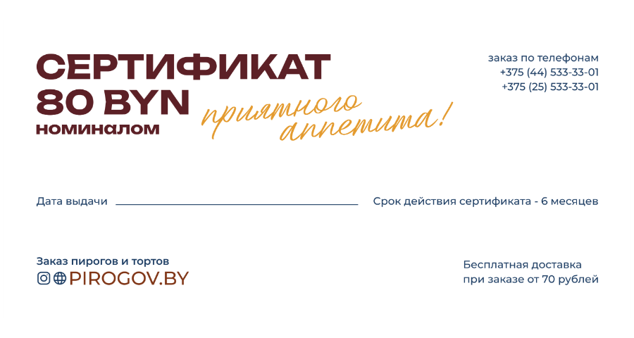 - Самовывоз возможен ежедневно с 9:00 до 21:00 по адресу: г. Минск, ул. Раковская 25/2, кафе Pirogov.by